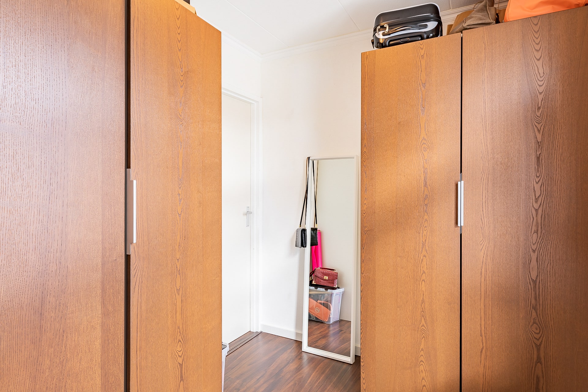 In de entree begint de vaste trap die uitkomt op de overloop van de eerste verdieping. Van daaruit zijn vervolgens drie ruime slaapkamers te bereiken. Deze zijn stuk voor stuk uitgerust met een keurige laminaatvloer. Voor de muren is gekozen voor een afwisseling van neutrale en kleurrijke afwerkingen. Verder heb je vanuit één van slaapkamers aan de achterkant toegang tot een dakterras van bijna twintig vierkante meter groot. De kozijnen aan de achterzijde zijn ook voorzien val rolluiken.